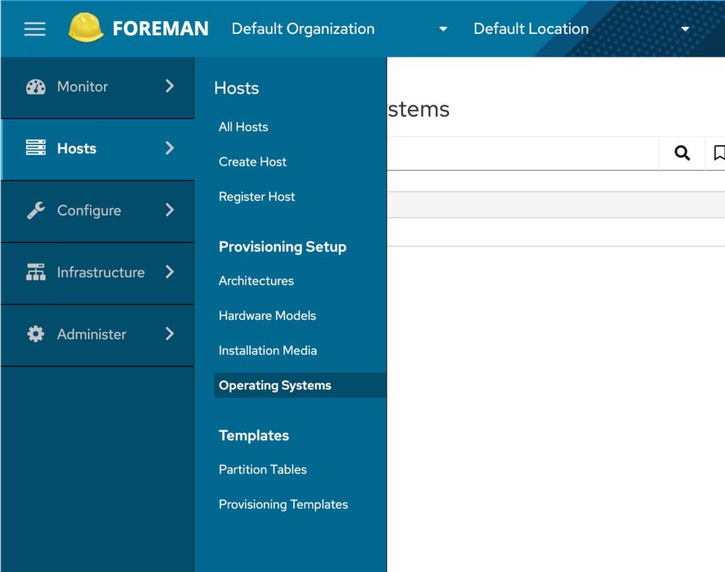 - Opret et Operativsystem: Gå til Hosts -> Operating Systems og opret en post for det OS, du vil registrere (f.eks. CentOS 8). Du behøver kun at angive navn, version og OS-familie.