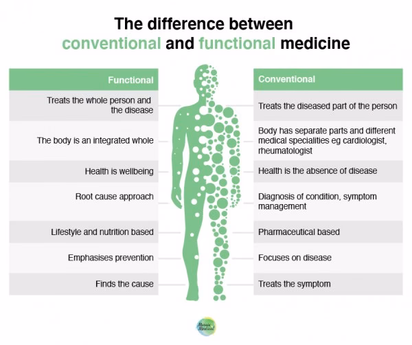 For at gøre forskellene klarere, kan man opstille en sammenligning mellem de to tilgange. Det er vigtigt at understrege, at de ikke er modstandere, men kan supplere hinanden utroligt godt. Traditionel medicin er uovertruffen til akut behandling af skader og livstruende sygdomme, mens funktionel medicin har sin styrke inden for kroniske lidelser.