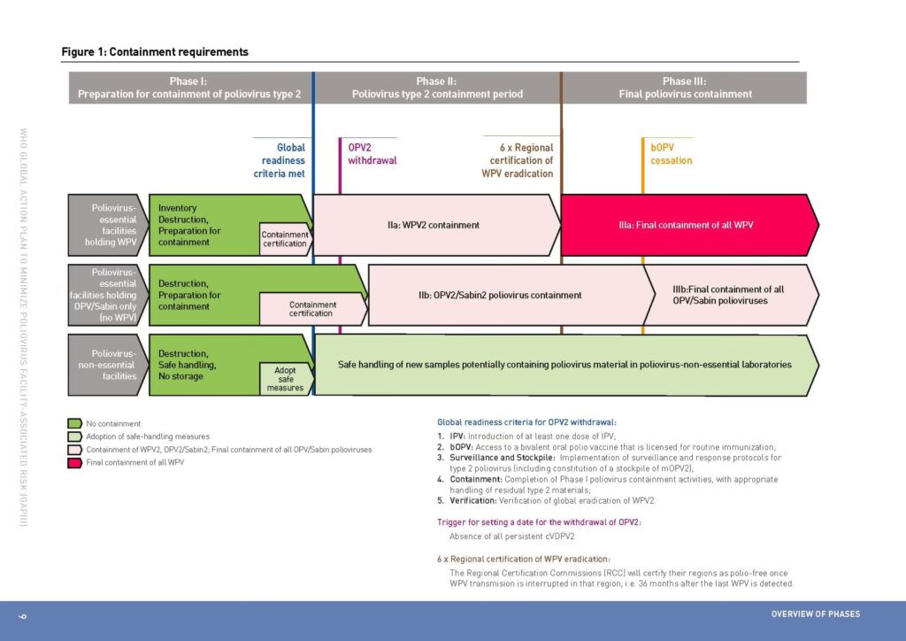 • Fase III: Endelig Polioindeslutning (fra 2019 og frem): Den sidste fase begynder, når alle typer af vild poliovirus er globalt udryddet. På dette tidspunkt vil kravene om indeslutning gælde for alle poliovirustyper (type 1 og 3), ikke kun type 2. Målet er at nå et punkt, hvor kun et absolut minimum af højsikrede faciliteter i verden opbevarer poliovirus under de strengeste internationale standarder.
