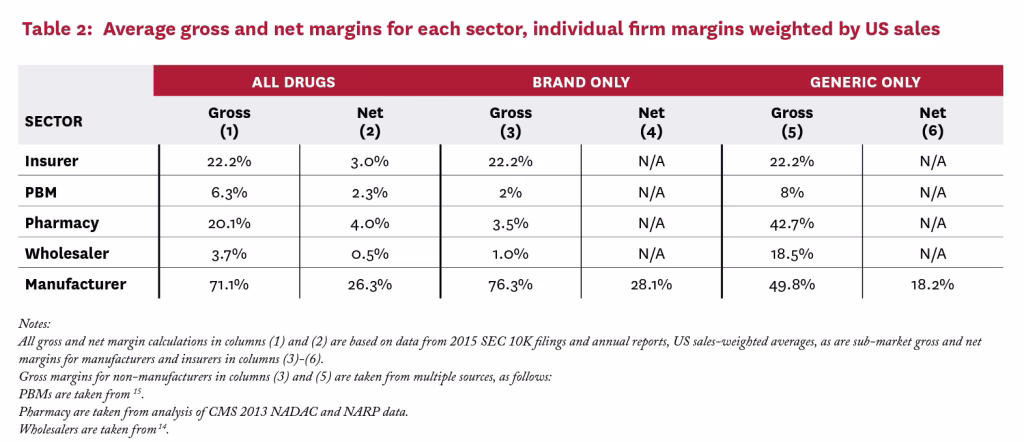 For at illustrere forskellene er her en oversigt over de gennemsnitlige profitmarginer for forskellige aktører i lægemiddelindustrien: