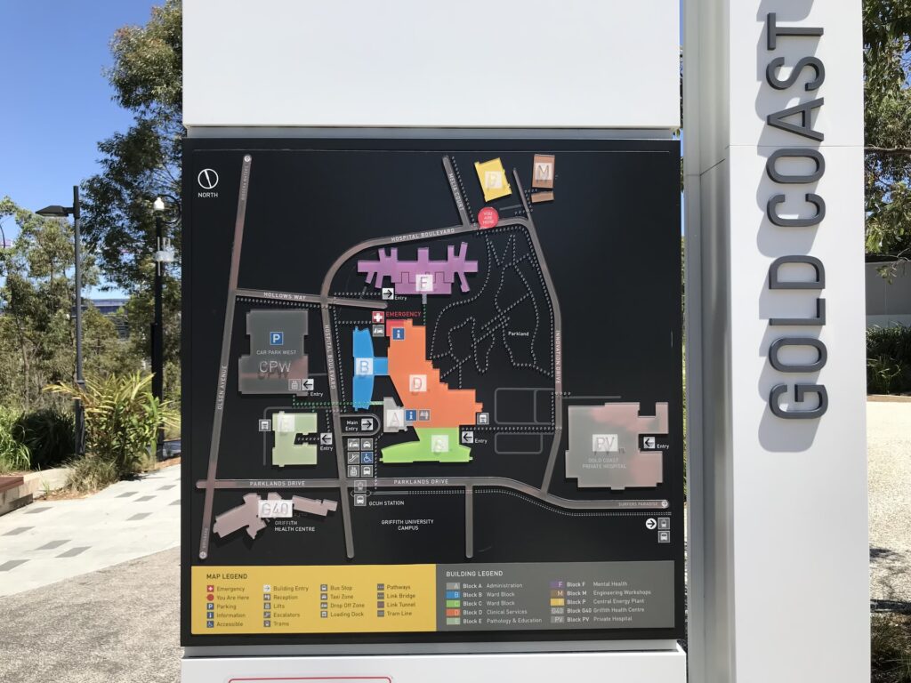 Gold Coast University Hospital anvender et gennemtænkt og intuitivt navigationssystem for at hjælpe patienter og besøgende med at finde rundt på det store område. Systemet er baseret på blokke, farver og logisk skiltning.