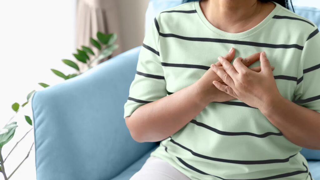- Brystsmerter eller ubehag: En trykkende eller klemmende fornemmelse i brystet.