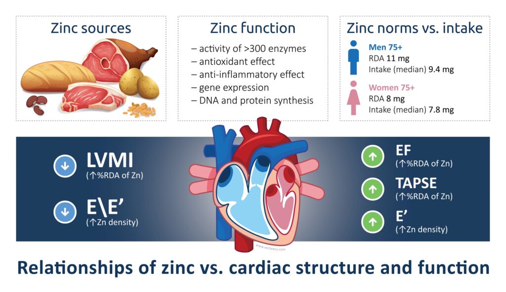 - Oxidativt stress: Zink har antioxidante egenskaber og hjælper med at beskytte cellerne mod skader fra frie radikaler (oxidativt stress). Både zinkmangel og -overskud kan forstyrre denne beskyttelse, hvilket kan føre til inflammation og skade på hjertevævet.