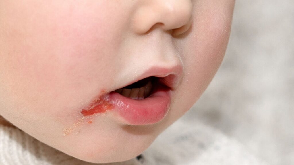 Symptomerne er typisk høj feber og små, smertefulde blærer og sår i hele munden – på tungen, gummerne og indersiden af kinderne. Barnet vil ofte savle meget og nægte at spise eller drikke på grund af smerter. Det vigtigste her er at sikre, at barnet får nok væske for at undgå dehydrering. Kontakt altid lægen, som kan vejlede om smertelindring og vurdere, om der er behov for yderligere behandling.
