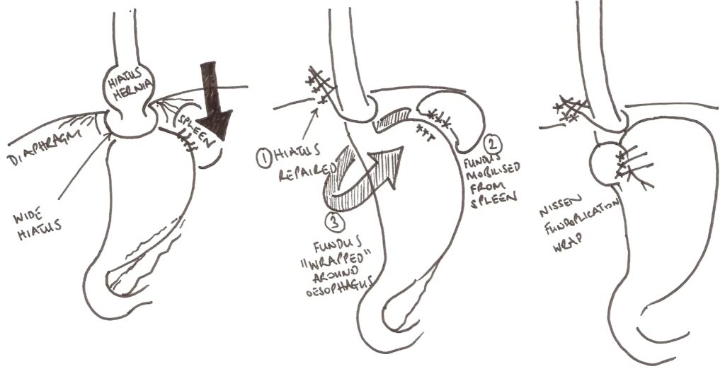 - Reparation af brokket: Kirurgen trækker mavesækken tilbage til sin korrekte position under mellemgulvet. Derefter strammes åbningen i mellemgulvet (hiatus) med sting for at forhindre, at mavesækken glider op igen.