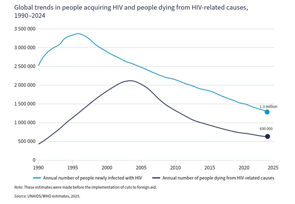 Samtidig døde omkring 630.000 mennesker af AIDS-relaterede sygdomme i 2022. Hvert eneste dødsfald er en tragedie, især fordi de fleste kunne have været undgået med rettidig diagnose og behandling. Faldet i antallet af dødsfald er markant sammenlignet med toppen af epidemien, men det viser også, at der stadig er store huller i adgangen til sundhedsydelser og behandling globalt set.