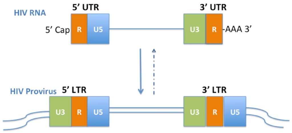 Gennem en række molekylære 'hop' og syntesetrin skaber omvendt transkriptase en DNA-streng, hvor en fuld kopi af U3-R-U5-sekvensen findes i begge ender. Resultatet er et provirus, der er flankeret af to identiske LTR'er: en 5'-LTR og en 3'-LTR. Disse fungerer som bogstøtter for de virale gener (såsom Gag, Pol og Env), der koder for de proteiner, der er nødvendige for at bygge nye viruspartikler.