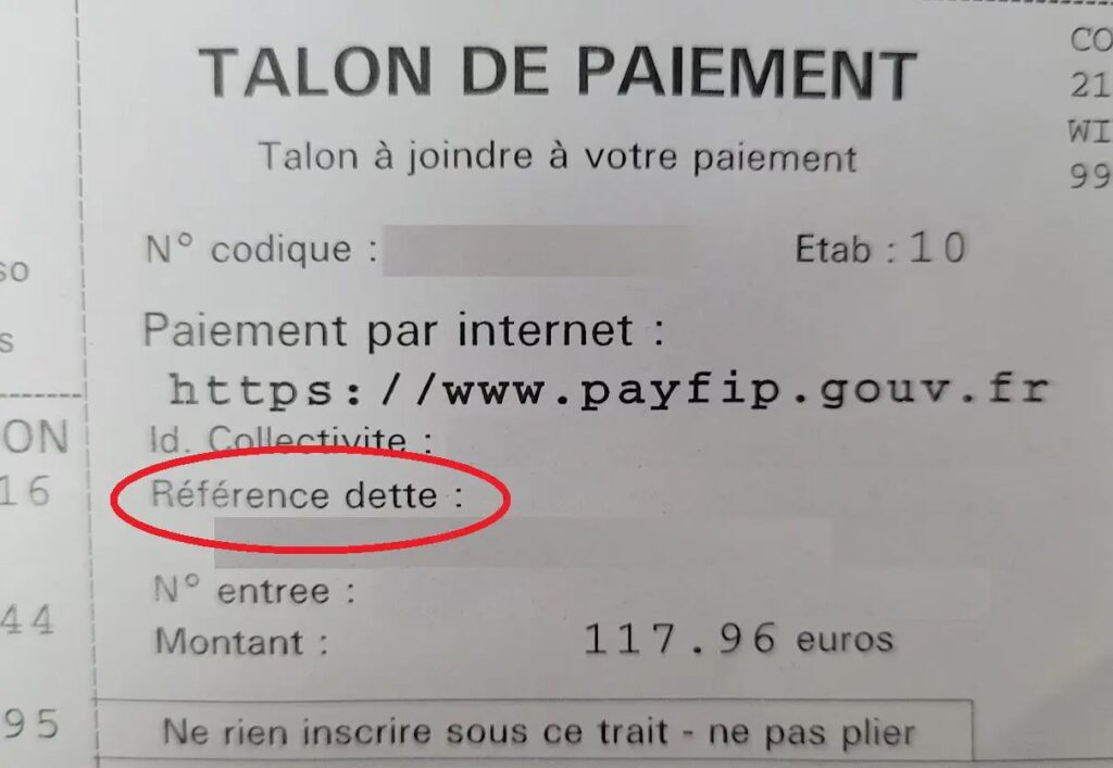 På næste side skal du indtaste to oplysninger: reference på gælden ("reference number") og beløbet ("billing amount"). Referencenummeret kan være lidt svært at finde. Det består af to talrækker adskilt af en bindestreg og findes under teksten Référence de la dette på din regning.