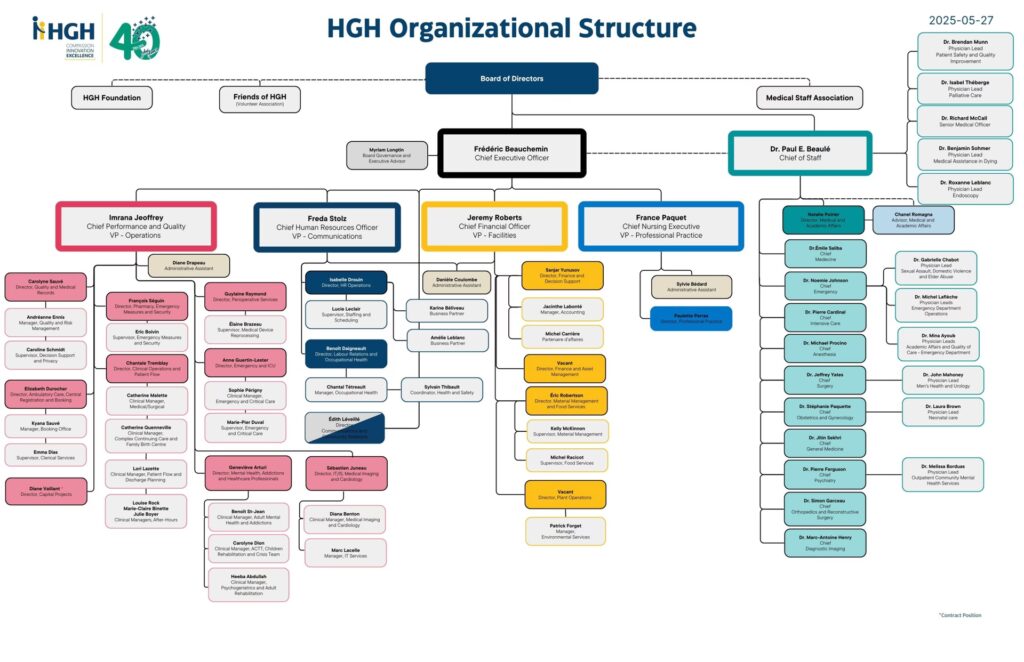 De fleste hospitaler anvender en vertikal struktur til at illustrere personalets hierarki og definere kommandovejen inden for hvert team. Øverst i hierarkiet findes typisk bestyrelsen og den administrerende direktør (C-suite). Under dem følger afdelingsledere, sektionschefer, oversygeplejersker og læger. Længere nede i hierarkiet finder man sygeplejersker, teknisk personale og andre sundhedsprofessionelle. Dette hierarki er afgørende for at skabe klarhed over beslutningsmyndighed og ansvar. Det sikrer, at der er en klar vej for eskalering af problemer og for godkendelse af procedurer, hvilket er essentielt i et miljø, hvor hurtige og korrekte beslutninger kan redde liv.