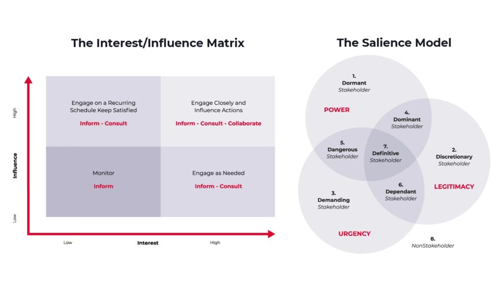 Når listen er komplet, skal interessenterne analyseres. En almindelig metode er at bruge en interesse/indflydelses-matrix, hvor hver interessent placeres baseret på deres niveau af interesse i projektet og deres magt til at påvirke det. Dette hjælper med at prioritere, hvem der kræver mest opmærksomhed.