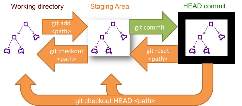 For at forstå disse niveauer, må vi se på Gits tre arbejdsområder: Arbejdsmappen (Operationsstuen, hvor du arbejder på filerne), Staging Index (Forberedelsesområdet, hvor ændringer gøres klar til operation/commit), og Commit Historikken (Den permanente journal).