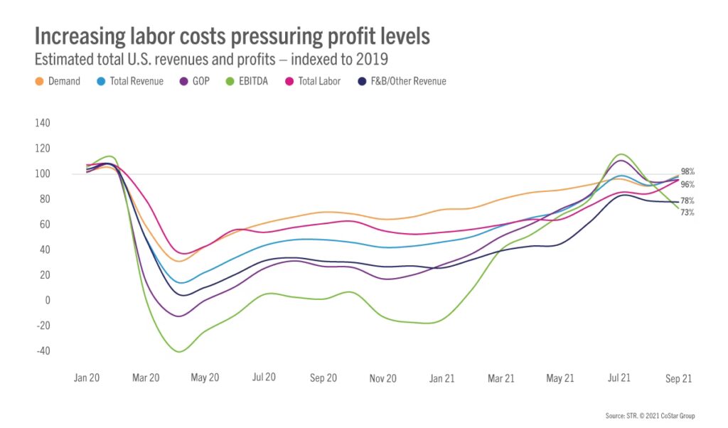 Under COVID-19-pandemien blev hotel- og restaurationsbranchen tvunget til at afskedige et stort antal medarbejdere. Mange af disse tidligere medarbejdere har siden fundet beskæftigelse i andre brancher, som måske tilbyder mere stabile arbejdstider, bedre løn eller færre weekendarbejdsdage. Da rejseaktiviteten vendte tilbage, opstod der en akut mangel på kvalificeret personale, fra receptionister og stuepiger til kokke og tjenere. Denne mangel på arbejdskraft har skabt en intens konkurrence om de tilgængelige talenter, hvilket uundgåeligt presser lønningerne opad, da hotellerne må byde over hinanden for at tiltrække og fastholde medarbejdere.