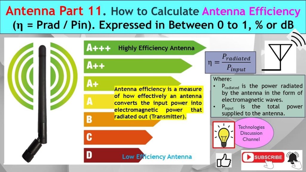 EffektivitetForholdet mellem den udsendte effekt og den strøm, antennen modtager fra enheden.En mere effektiv antenne bruger strømmen bedre, hvilket kan forlænge batterilevetiden og reducere den samlede mængde unødigt udsendt energi.