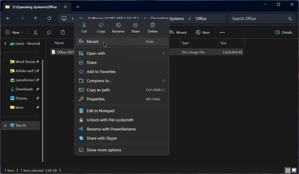 - Vælg 'Monter': I menuen vil du se en mulighed, der hedder 'Monter' (eller 'Mount' på engelsk). Klik på denne. Hvis du ikke kan se denne mulighed, kan det være, at et andet program (som f.eks. WinRAR) har overtaget ISO-filtypen. I så fald kan du højreklikke, vælge 'Åbn med' og derefter vælge 'Windows Stifinder'.