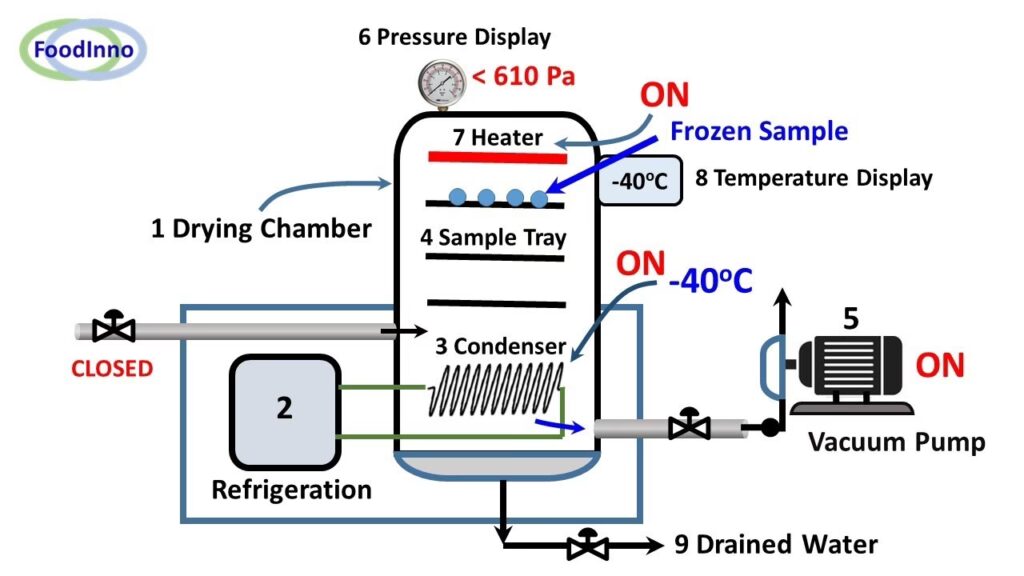 Under vakuum sænkes trykket drastisk. Dette lave tryk tillader isen i fødevaren at gå direkte fra fast form (is) til gasform (damp) uden at passere gennem en flydende fase. Denne proces kaldes sublimation. Fordelen ved sublimation er, at vandet fjernes, mens fødevarens struktur, farve, smag og, vigtigst af alt, næringsstoffer bevares næsten fuldstændigt. Resultatet er et ultralet, sprødt produkt, der kan rehydreres til sin oprindelige tilstand ved blot at tilsætte vand, eller nydes som en sprød snack.
