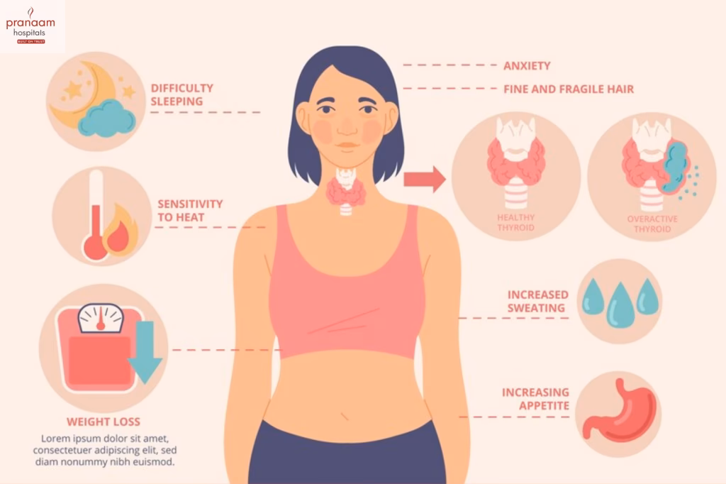 Ved hyperthyreose er der en overproduktion af skjoldbruskkirtelhormoner. Dette sætter kroppens motor i overgear. Symptomerne inkluderer rastløshed, hjertebanken, svedtendens, søvnløshed og typisk vægttab på trods af en glubende appetit. Som tidligere nævnt skyldes den øgede appetit dels kroppens forsøg på at indhente det enorme kalorieforbrug, men også en direkte stimulering af sultcentrene i hjernen fra det høje T3-niveau.