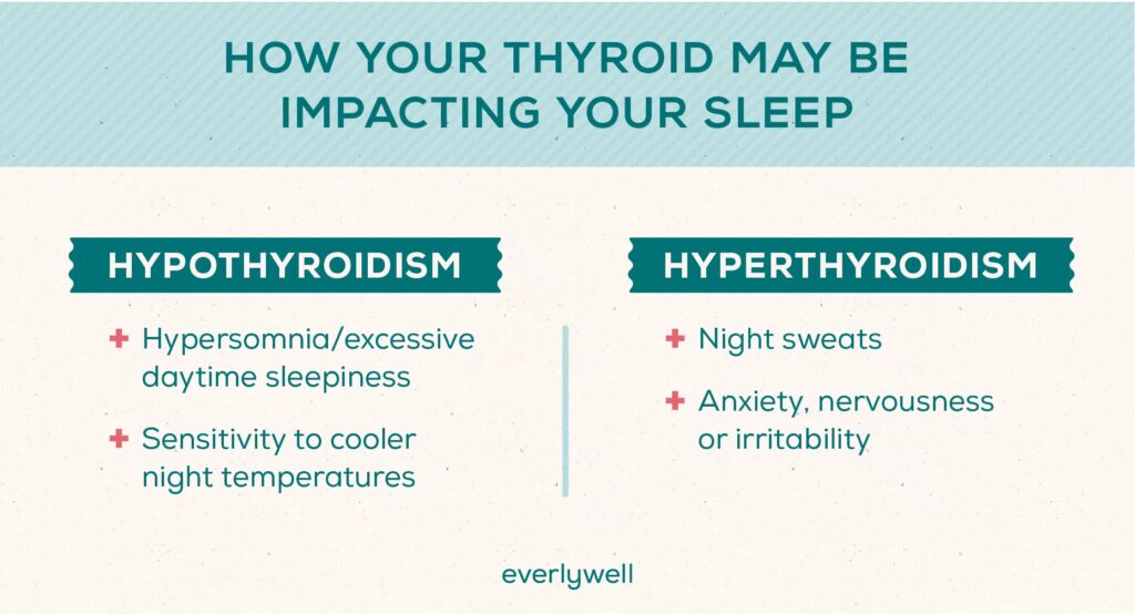 Hyperthyroidisme, eller for højt stofskifte, opstår, når skjoldbruskkirtlen producerer for meget hormon, hvilket får kroppens processer til at accelerere. I stedet for at føle sig sløv, kan en person føle sig mentalt overstimuleret og rastløs. Dette kan gøre det næsten umuligt at slappe af om aftenen. Med hyperthyroidisme er søvnproblemer som søvnløshed almindelige:
