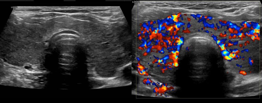 - Autoimmune sygdomme (Hashimoto's og Graves'): Ved autoimmune sygdomme som Hashimoto's thyroiditis (den hyppigste årsag til lavt stofskifte) og Graves' sygdom (den hyppigste årsag til højt stofskifte) får skjoldbruskkirtlen ofte et karakteristisk udseende på ultralyd. Vævet kan fremstå diffust hypoekkoisk og heterogent (plettet). Ved Graves' sygdom kan farve-Doppler vise en dramatisk øget blodgennemstrømning, et fænomen der sommetider kaldes "thyroid inferno".