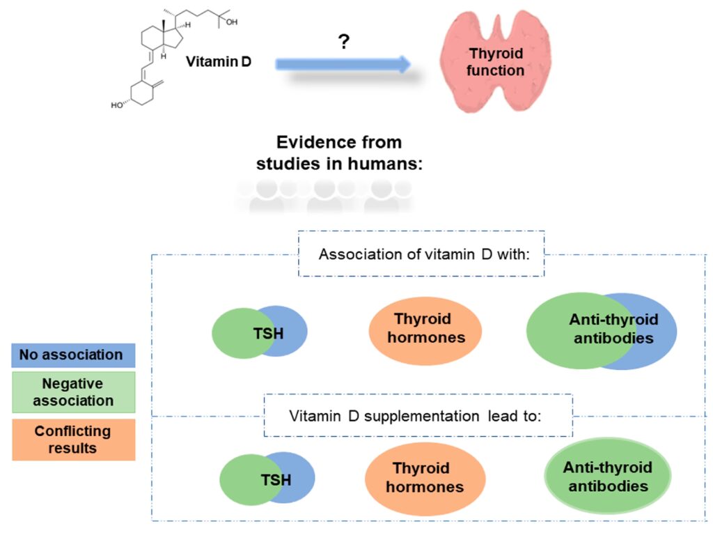 Adskillige studier har fundet en stærk sammenhæng mellem lave niveauer af D-vitamin og en øget forekomst og sværhedsgrad af disse autoimmune sygdomme. En stor meta-analyse har vist, at patienter med Hashimoto's thyroiditis har signifikant lavere D-vitaminniveauer end raske kontrolpersoner. Den formodede mekanisme er D-vitamins antiinflammatoriske og immunmodulerende egenskaber. D-vitamin kan hæmme produktionen af proinflammatoriske cytokiner (signalstoffer, der fremmer betændelse) og øge produktionen af antiinflammatoriske cytokiner. Dette kan hjælpe med at dæmpe det autoimmune angreb på skjoldbruskkirtlen. Det er dog stadig et åbent spørgsmål for forskerne, om D-vitaminmangel er en direkte årsag til sygdommen, eller om det er en konsekvens af den kroniske inflammation, som sygdommen medfører.