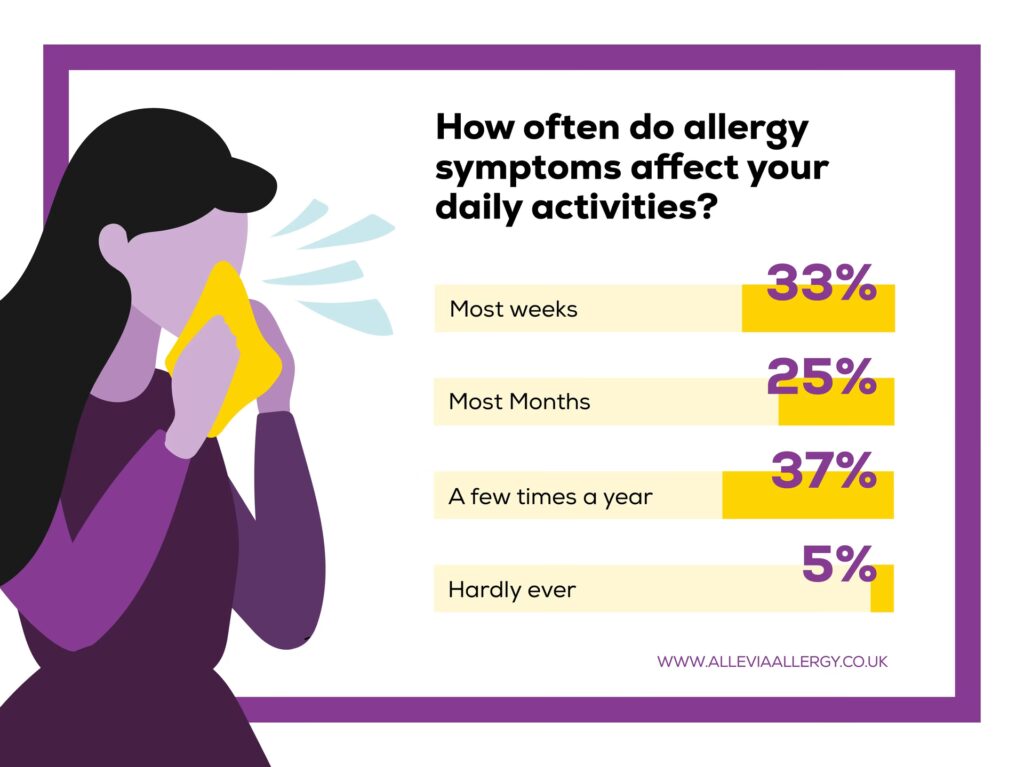 - Trykken for brystet og åndenød (kan være tegn på astma, der ofte er allergirelateret)