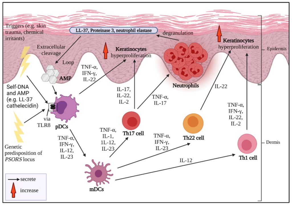 Psoriasis er typisk forbundet med Th17/IL-23-aksen. Her er det T-hjælper 17-celler og cytokiner som IL-17 og IL-23, der driver inflammationen, som resulterer i de karakteristiske tykke, skællende plaques. Spørgsmålet er derfor: Hvordan kan en medicin, der dæmper Th2-responset, aktivere Th17-responset?