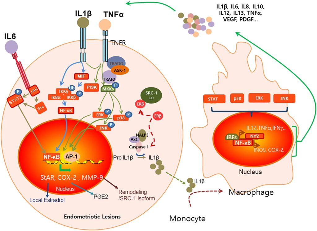 Women with endometriosis have elevated levels of key pro-inflammatory cytokines, i.e. IL-1β, IL-6, and TNF-α. At the same time, IL-1β and IL-6 could be used as predictors for endometriosis. Endometriosis is a pelvic inflammatory condition defined as the presence of ectopic deposits of endometrial tissue outside of the uterine cavity.