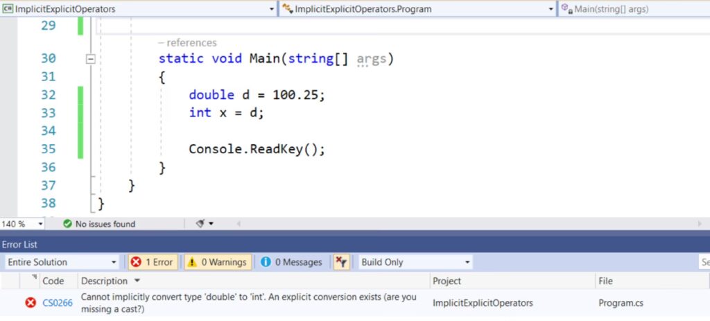 Point position = new Point(3.5, 4.8); // Uden en cast vil dette give en kompileringsfejl: // int distance = position; // FEJL: Cannot implicitly convert type 'Point' to 'int'. // Med en eksplicit cast fungerer det: int distance = (int)position; Console.WriteLine(distance); // Output vil være 5 (afstanden er ca. 5.9, som bliver til 5 efter cast til int)