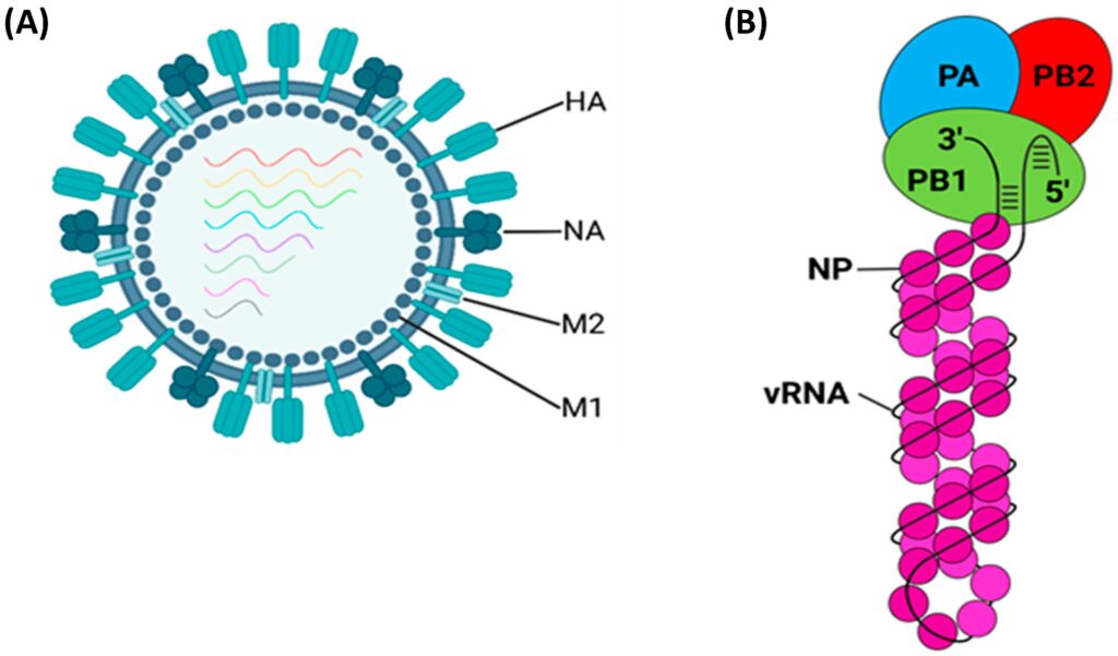 Influenzavirus tilhører familien Orthomyxoviridae. Kun influenza A- og B-vira er ansvarlige for de epidemier, vi oplever hos mennesker. Et influenzavirus er en mikroskopisk partikel, typisk 50-120 nanometer i diameter, med en kompleks opbygning. Yderst har den en fedtmembran, en såkaldt kappe, som den stjæler fra værtscellen, når den forlader den. Indlejret i denne kappe sidder to afgørende overfladeproteiner, der fungerer som virussets nøgler og værktøjer: