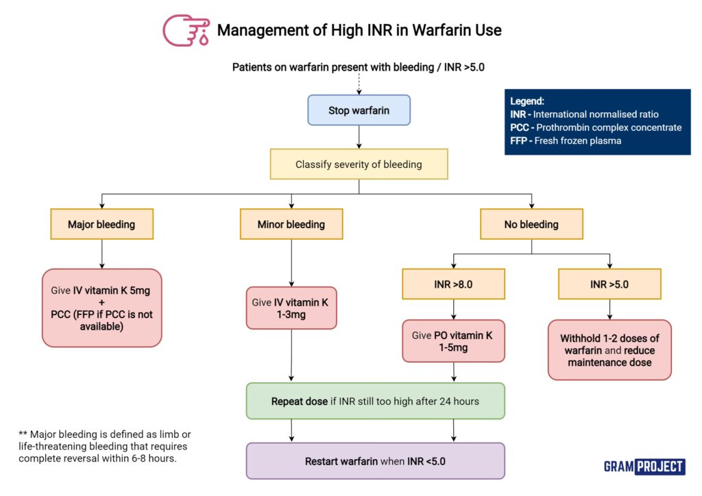 Hvis din INR er for høj, betyder det, at din risiko for blødning er øget. Kontakt straks din læge eller det ambulatorium, der styrer din behandling. Panik ikke. Afhængigt af hvor høj værdien er, og om du har tegn på blødning, kan lægen råde dig til at springe en dosis over, nedsætte din dosis midlertidigt eller i sjældne tilfælde give dig en lille dosis K-vitamin for at modvirke effekten.
