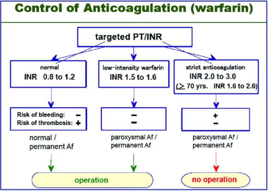 Generelt gælder det, at for større kirurgiske indgreb skal INR-værdien være normaliseret, typisk under 1,5, og helst under 1,3. For at opnå dette vil patienten i samråd med lægen skulle pausere sin blodfortyndende behandling i flere dage op til operationen. I nogle tilfælde kan det være nødvendigt at 'bygge bro' med en anden type korttidsvirkende blodfortyndende medicin (f.eks. heparin-indsprøjtninger) for at beskytte mod blodpropper i pausen.