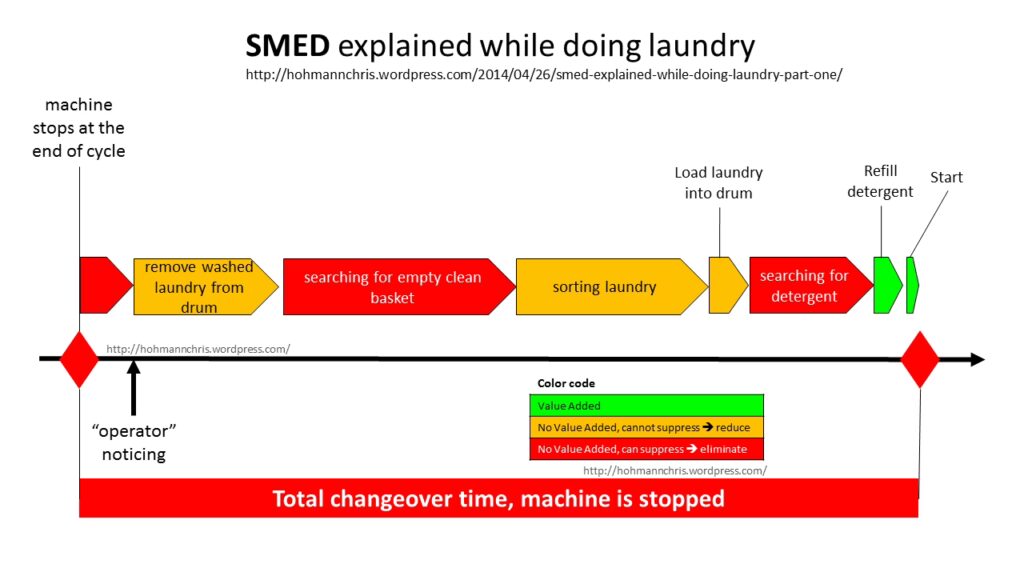 - Interne opgaver (Internal Setup): Dette er opgaver, der kun kan udføres, når maskinen eller processen er stoppet. Det kan for eksempel være afmontering af et værktøj, rengøring af en central komponent eller montering af en ny del. Disse opgaver er den direkte årsag til nedetid.
