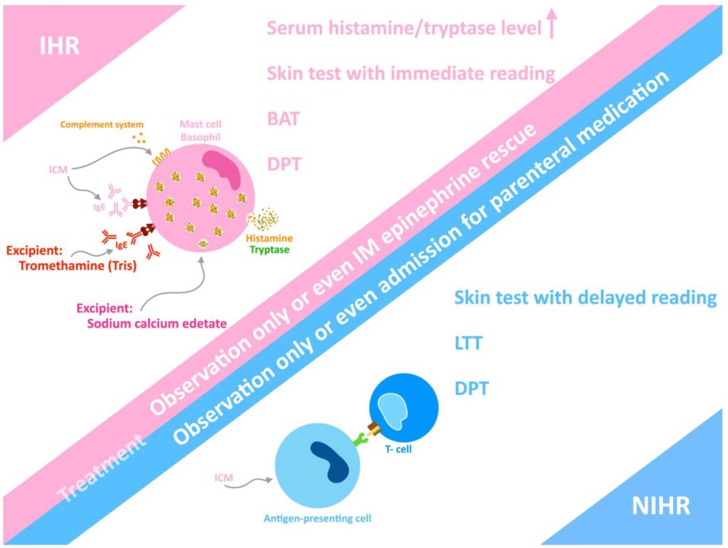 - Provokationstest (Drug Provocation Test - DPT): Dette betragtes som guldstandarden for diagnose. Under tæt overvågning på et hospital får patienten en kontrolleret dosis af det mistænkte kontraststof for definitivt at bekræfte eller afkræfte allergien. Denne test bruges også til at finde et sikkert alternativt kontraststof, som patienten kan tåle, selv hvis hudtesten for dette alternativ var negativ. Forskning viser, at selv med en negativ hudtest kan over 60% af patienter med multipel allergi stadig reagere under en provokationstest, hvilket viser, hvor afgørende denne test er.