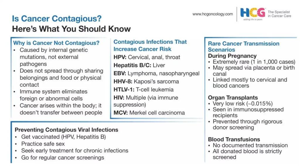 Dette er et af de områder, der oftest skaber forvirring. Selvom kræft i sig selv ikke er smitsomt, er der flere vira, bakterier og parasitter, som er smitsomme, og som kan øge en persons risiko for at udvikle bestemte former for kræft senere i livet. Det er vigtigt at understrege: Det er infektionen, der smitter – ikke kræften.
