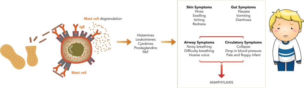 For at forstå, hvordan AIT virker, må vi se på, hvad der sker i kroppen under en allergisk reaktion. Hos en allergiker identificerer immunsystemet fejlagtigt et harmløst protein (et allergen, f.eks. fra jordnødder) som en trussel. Dette udløser en kaskade af reaktioner, hvor der produceres store mængder af antistoffet Immunoglobulin E (IgE). Disse IgE-antistoffer binder sig til overfladen af mastceller og basofiler, som er celler fyldt med inflammatoriske stoffer som histamin. Næste gang kroppen møder allergenet, binder det sig til IgE på disse celler, hvilket får dem til at frigive deres indhold og forårsage de velkendte allergisymptomer: kløe, hævelse, nældefeber, vejrtrækningsbesvær og i værste fald anafylaksi.
