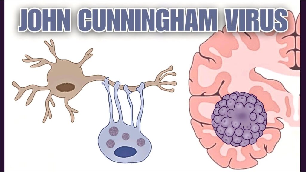 Man mener, at virusset krydser blod-hjerne-barrieren, muligvis ved at bruge inficerede B-lymfocytter som en 'trojansk hest'. Når det er inde i hjernen, har virusset en forkærlighed for specifikke celletyper. Dets primære mål er oligodendrocytter. Disse celler er ansvarlige for at producere myelin, et fedtholdigt stof, der danner en beskyttende skede omkring nervefibre (axoner). Myelinskeden er afgørende for hurtig og effektiv transmission af nervesignaler.