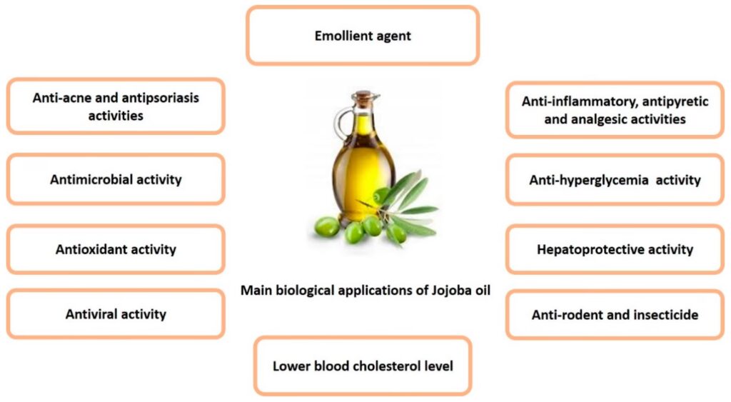 Jojobaoliens anti-inflammatoriske virkning gør den ideel til at lindre irriteret hud, solskoldning og andre hudlidelser som psoriasis og rosacea. Den kan blidt fjerne makeup uden at irritere huden og er en fremragende base for beroligende ansigts- og kropsbehandlinger.