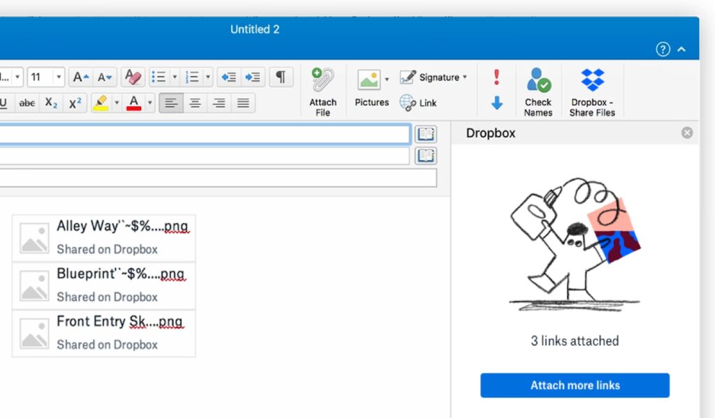 For at gøre processen så smidig som muligt, kan du installere det officielle Dropbox-tilføjelsesprogram. Dette tilføjer en Dropbox-knap direkte i dit Outlook-interface, både på computeren og i web-versionen.