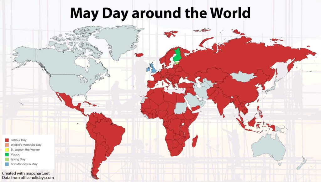 | Størstedelen af Europa | 1. maj | Offentlig helligdag med store demonstrationer organiseret af fagforeninger og venstrefløjspartier. |