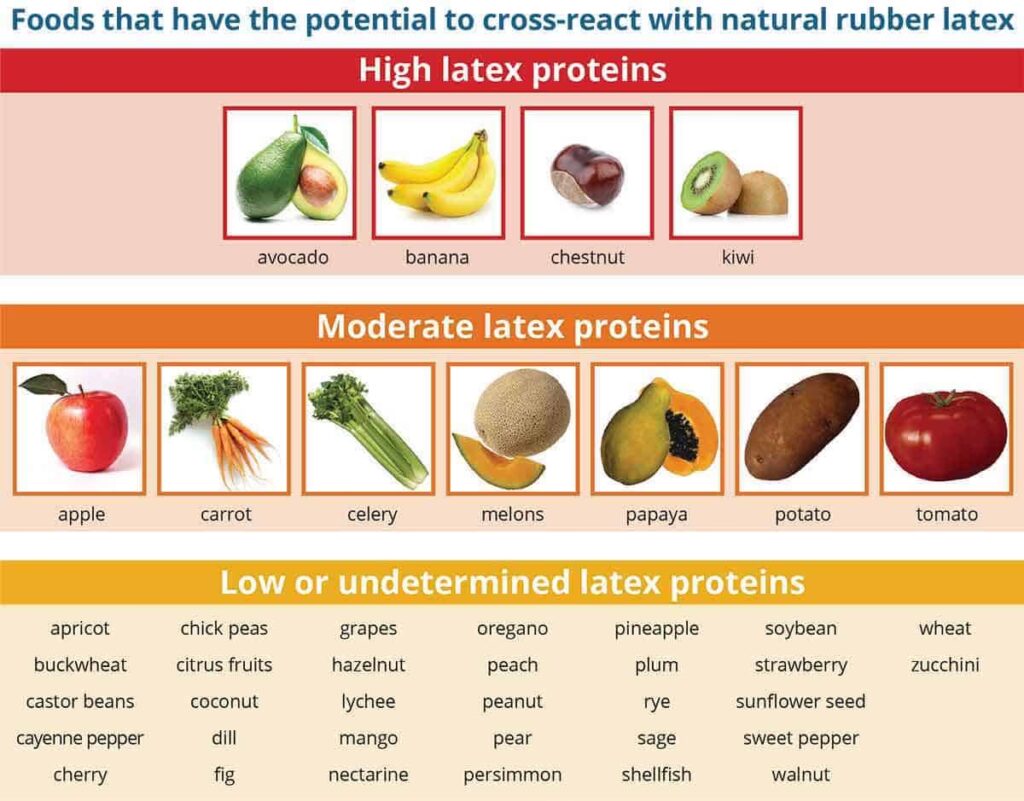 Det anslås, at omkring 30-50% af personer med latexallergi oplever en krydsreaktion med en eller flere fødevarer. De mest almindelige syndere er: