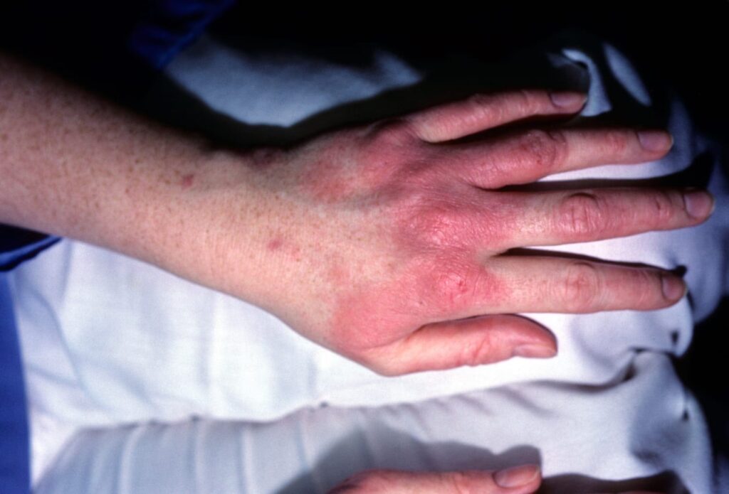 Dette er den mest almindelige, men mindst farlige reaktion. Den skyldes typisk de kemikalier, der tilsættes latexen under fremstillingsprocessen, snarere end selve latexproteinet. Symptomerne opstår normalt 12 til 36 timer efter kontakt.