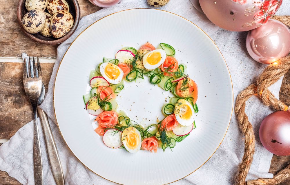 • Røget laks på en ny måde: Server tynde skiver af kvalitetsrøget laks på en bund af sprød salat. I stedet for den traditionelle røræg, prøv med en let peberrodscreme, kapers, rødløg og små dildkviste. En klat stenbiderrogn kan løfte retten til nye højder.