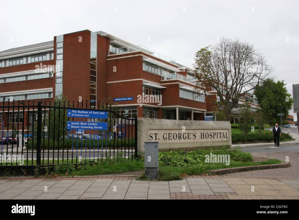 - Linjer med stop tæt ved hospitalet: 44, 57, 77, 155, 264, 270, 280. Disse busser stopper ved stoppesteder som 'St George's / University Of London' (Stoppested HA og HB) på Blackshaw Road eller 'Cranmer Terrace' (Stoppested HK), som alle er få minutters gang fra indgangen.