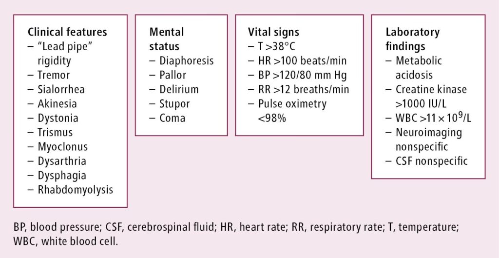 | Muskelstivhed | Ekstrem ("blyrør") | Mindre udtalt, ofte med ryk (myoklonus) | Ekstrem, især i kæbemuskler |