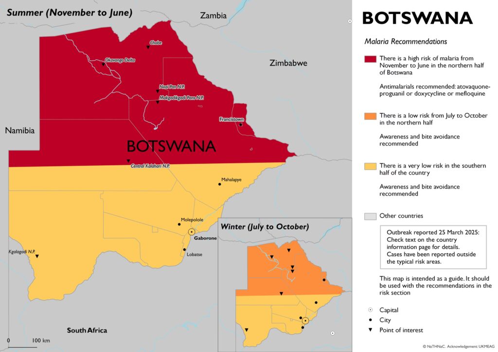 Traditionelt set har malaria primært været et problem i de nordlige, mere fugtige regioner. Udbruddet startede da også i Okavango, men har siden spredt sig til andre distrikter, herunder Ngami, Ghanzi, Chobe, Tutume og Boteti. Mere alarmerende er det, at der nu også rapporteres tilfælde i områder, der normalt betragtes som ikke-endemiske, såsom Gaborone, Francistown, Serowe og Mahalapye. Dette betyder, at rejsende skal være på vagt i hele landet og ikke kun i de kendte risikozoner.