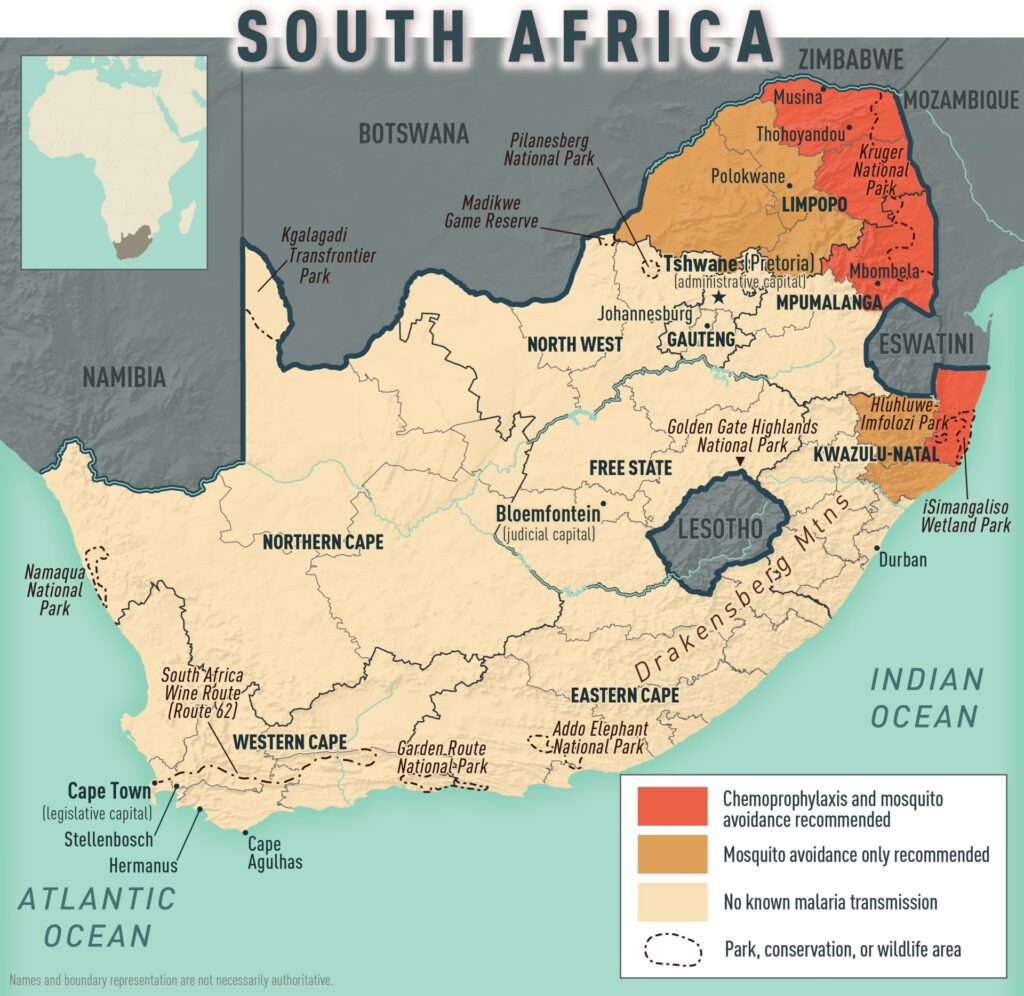 In South Africa, malaria is mainly transmitted by mosquitos found along low-altitude border areas of three provinces – Limpopo, Mpumalanga and KwaZulu-Natal, where it’s always present. If you’re travelling there, take great care, especially at this time of the year. In Africa, six countries account for about half of all malaria deaths worldwide.