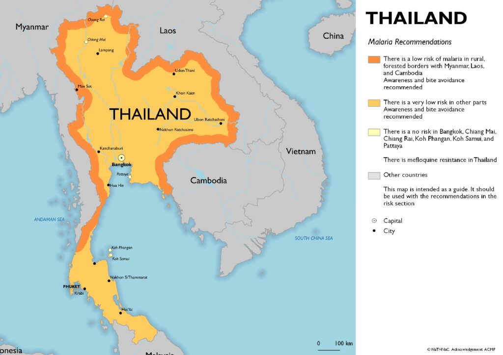 Risikoen er højest i landlige, skovklædte områder langs grænserne til Myanmar, Cambodja og Laos. Store byer og populære turistøer som Phuket og Koh Samui har en yderst lav til ingen risiko.