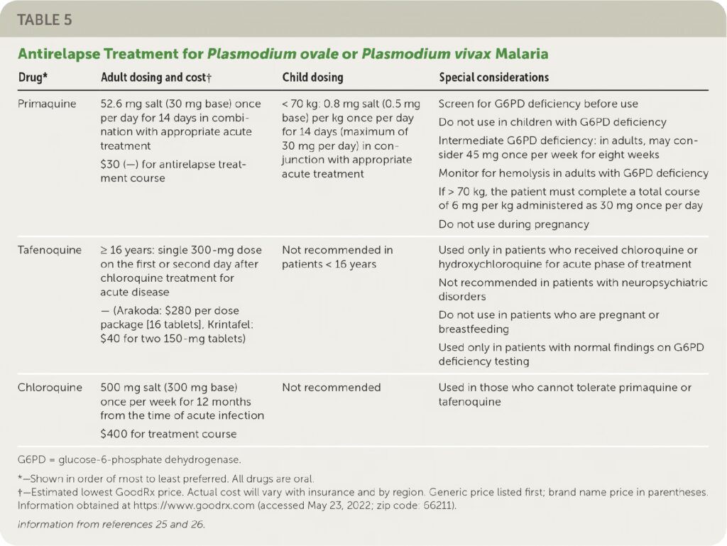 Plasmodium vivax og Plasmodium ovale: Disse parasitter er kendetegnet ved, at de kan danne sovende stadier i leveren, kaldet hypnozoitter. Disse kan reaktiveres uger, måneder eller endda år efter den oprindelige infektion og forårsage tilbagefald. Behandlingen kræver derfor en todelt tilgang: Først behandles den akutte infektion i blodet (ofte med klorokin i områder uden resistens), og derefter gives en supplerende behandling med primakin eller tafenoquin for at udrydde hypnozoitterne i leveren. Før behandling med disse lægemidler er det vigtigt at teste for en enzymmangel kaldet G6PD-mangel, da medicinen kan forårsage alvorlig blodmangel hos personer med denne tilstand.