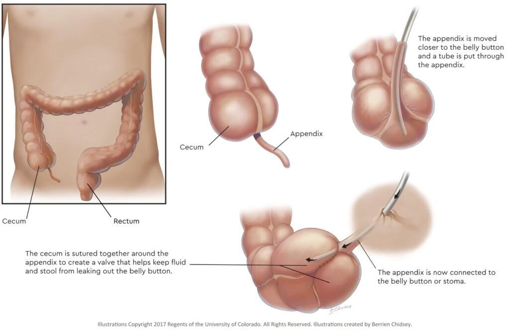 Under operationen, som typisk varer mellem 1,5 og 2 timer, isoleres blindtarmen fra sin normale position. Spidsen af blindtarmen føres ud gennem en lille, nyåbnet kanal i bugvæggen, oftest i højre side af maven eller diskret placeret i navlen. Der skabes en slags ventilmekanisme for at forhindre afføring i at lække ud gennem stomien. Efter operationen efterlades et midlertidigt kateter i den nye åbning for at holde den åben, mens den heler. Dette kateter fjernes typisk efter et par uger, hvorefter patienten oplæres i at bruge et engangskateter til skylningerne.