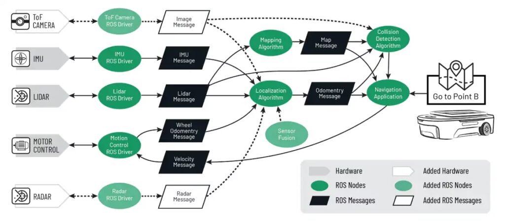 Dette opnås gennem en modulær tilgang. Et robotsystem i ROS er opdelt i små, uafhængige programmer kaldet Noder (Nodes). Hver node har ansvaret for en specifik opgave, f.eks. at læse data fra en laserscanner, styre motorerne eller udføre kortlægningsalgoritmen. Disse noder kommunikerer med hinanden ved at publicere og abonnere på datastrømme kaldet Topics. Dataene, der sendes over disse topics, er struktureret i formater kaldet Meddelelser (Messages). Denne arkitektur gør det nemt at udskifte, genbruge og distribuere softwarekomponenter, hvilket accelererer udviklingsprocessen markant.