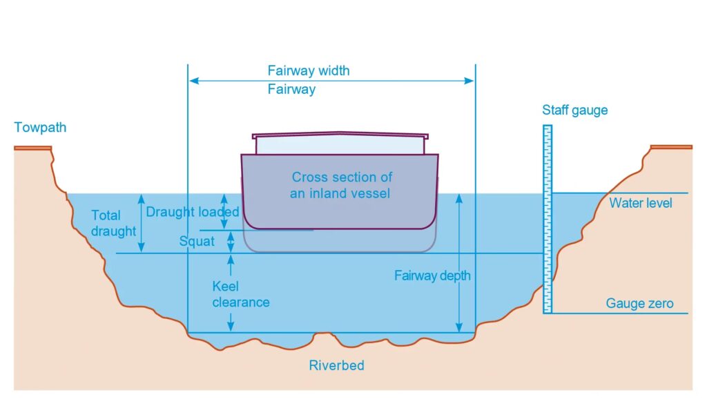 Den maksimale dybgang for et skib i en given vandvej er bestemt af den mindste vanddybde på ruten, fratrukket den nødvendige Under Keel Clearance (UKC). Havne og kanaler har altid en specificeret maksimal dybgang for at sikre sejlads uden risiko for grundstødning. For eksempel har Gøteborg Havn specifikke dybgangsrestriktioner for sine forskellige sejlrender og kajpladser. Ved kaj 801 er den maksimale dybgang 19,05 meter, men for at nå dertil skal skibet passere Trubaduren, hvor dybgangen ikke må overstige 18,9 meter. Disse grænser er fastsat for at opretholde en minimums-UKC, som typisk er 0,5 meter ved kaj og 0,7 meter i sejlrender.